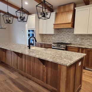 At the heart of the home is a vaulted great room with exposed beams, a statement fireplace, and custom built-ins, creating a warm and inviting central living space. The kitchen features a large island and two-tone custom cabinetry crafted from solid maple and hickory, combining durability with a refined, custom look.